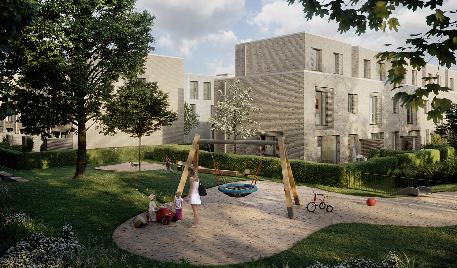 Dabei überzeugt jedes einzelne der Häuser mit seinem ganz eigenen Charme und fügt sich doch harmonisch in das Gesamtarrangement ein. Kinder spielen im Garten, die Erwachsenen treffen sich auf einen Schnack vor dem Haus – Adagio ist ein Ort, an dem aus Nachbarn Freunde werden. Betritt man das jeweilige Haus, verblüfft vor allem die großzügige Raumaufteilung. Die Wohnflächen reichen von ca. 131 bis ca. 166 m². Mit vier bis fünf Zimmern eröffnen sich dabei vielfältige Gestaltungsmöglichkeiten.